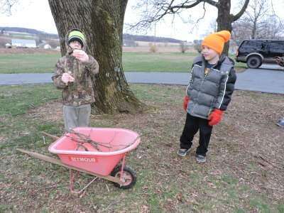 CONTRIBUTED PHOTOThe Lion Den of Cub Pack 588 performed a community service project at Saint Peter's Lynnville UCC, 5129 Schochary Road, New Tripoli, April 17. Despite the chilly breeze and snow showers, the Lion Den project included cleaning up trash, raking stones and preparing the bee garden for new growth. ABOVE: John Kostik and Dylan Miller help pick up sticks during the community service