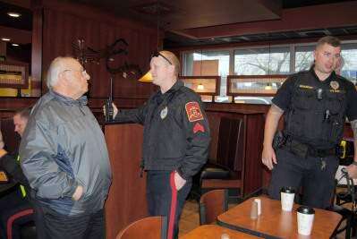 PRESS PHOTOS BY SUSAN BRYANTSam Lipot of South Whitehall speaks to Sgt. Stephen Brown with South Whitehall Township Police Department during a coffee with a cop event April 25 at McDonald's, 721 N. Cedar Crest Blvd., South Whitehall Township.