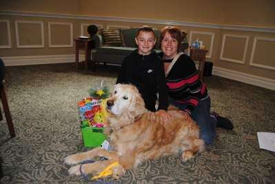 PRESS PHOTO BY SUSAN BRYANTLori and Anthony Schaefer of Wescosville visit with Sirius, owned by Charlene Piskula of Coplay, and his gift basket full of treats. They attended the April 29 pet loss and grief seminar at Stephens Funeral Home, Upper Macungie. Sirius was given the basket by Matt Stephens and the funeral home for his work as a Therapy Dog with Lehigh Valley Health Network.