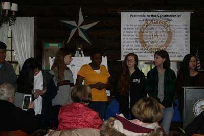 Roxanne Henry, in yellow, tells the audience and Nitschmann MS classmates that when she moved here from New Jersey, she was amazed by all the beautiful trees in Bethlehem. Rain forced the affair indoors at the Rose Garden log cabin.