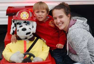 PRESS PHOTOS BY AL RECKERHayden Turner and his mother, Keri Osman, spend some time with Patches, a remote-controlled unit to teach kids about fire safety, during Whitehall Township Fire Department's open house, held May 6 at the Robert L. Benner Fire Training Center in West Catasauqua.