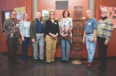 “The Ancient Ones Who Came Before No. 3,” unglazed stoneware, by Nancy E. Steffy is a piece that resembles delicate fossil-like bones. The artwork is in five separate pieces that appear to have been bleached white by the sun. They are assembled together, one atop the other, to form a hanging sculpture.