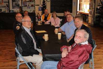 PRESS PHOTO BY PAUL CMILArea church leaders meet with Catasauqua's mayor, police chief and school superintendent to discuss coordinating their community outreach efforts during a gathering May 14 at Blocker's Coffeehouse. In attendance were the Rev. Douglas Cronce, Presbyterian Church of Catasauqua; Police Chief Douglas Kish; Mayor Barbara Schlegel (hidden); the Rev. Brian Riedy, Holy Trinity
