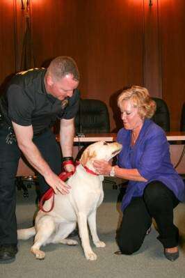City officials introduced May 10 the newest member of the community’s newest public safety member; Silver. A 2-year-old yellow Labrador, Silver joins the police department’s three more aggressive K9s as an arson dog, specially trained to search for the scent of chemicals and accelerants. She comes to the city through a longtime funding partnership with State Farm, and lives and works with Detective Douglas Nothstein. During the announcement, Mayor Bob Donchez grinned widely at the happy animal and said, “I’m gonna take her home.”