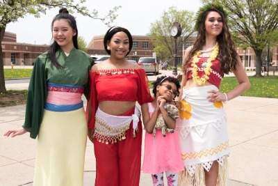 Parkland High School juniors Alexa Pena as Mulan, Maritza Almont as Jasmine, and Madison Lichtenwalner as Moana, visit with Eliana Madison-Hill, 7, from Slatington during the princess camp fundraiser.PRESS PHOTO BY LOU WHEELAND Copyright - Lou Wheeland