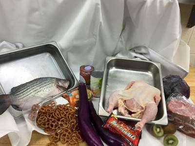 PRESS PHOTOS BY JOANNA IRELANDThe ingredients in the mystery basket included striped bass, pretzels, ramen noodles, a chicken, Japanese eggplant, a can of corn, kiwi, red cabbage, shoulder bacon and Hot Tamales, donated by Just Born. The contestants had access to the kitchen's pantry for all other ingredients.