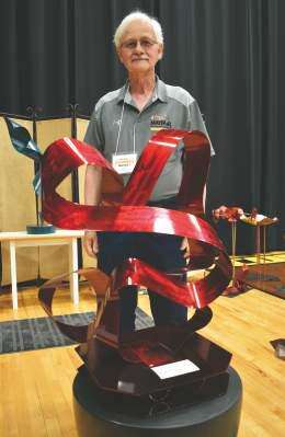 1963 Parkland High School graduate Hershel Dorney stands behind his red ribbon-like metal garden sculpture at the 2018 Mayfair Festival of the Arts. He and other arts and crafts vendors were set up in Cedar Crest's Lees Hall. Dorney said he is looking forward to his 55th class reunion this year.PRESS PHOTOS BY ED COURRIER Copyright - &Copy; Ed Courrier