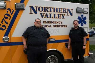 PRESS PHOTO BY DEBRA PALMIERINorthern Valley Ambulance Corps EMT Steve Reimert and Pre-hospital Registered Nurse Ryan Schwartz attended the June 3 Heidelberg Church picnic. The two stood by with the new NOVA ambulance just in case they would be needed at the event. The 2-week-old ambulance was generously donated by L. Johnson.