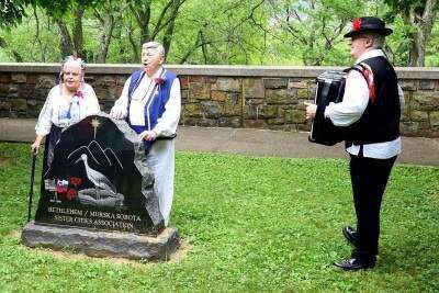 PRESS PHOTOS BY DANA GRUBBBetty Sylva, Frank Podleiszek and Alex Gergar provides vocal and instrumental accompaniment on the American and Slovenian national anthems, as well as on “God Bless America” at the Bethlehem-Murska Sobota Sister Cities Association monument, located at the City Center garden near the library.