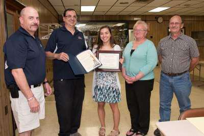 PRESS PHOTO BY LOU WHEELANDGood Will Fire Company No. 1 Trexlertown Fire Marshal Dennis McArdle, Fire Chief Stephen Oplinger, Fred J. Gross Award recipient Olivia Morren of Upper Macungie, Ladies Auxiliary President Linda Gorr and fire company President Gary Gorr attended the Fred J. Gross Memorial Community Service Award ceremony. Copyright - Lou Wheeland