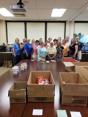 PRESS PHOTO COURTESY NANCY HANDWERKJoan Bettler, Anna Jean Henry, Janice Metzger, (middle) Joyce Eckhart, Debbie Peters, Nancy Zellner, Diane Ruff, Trudie Dellicker, Jennifer Holman, (back) Gloria Zimmerman, Dr. Mary Anne Wright, Sharon Naugle, Helen McCauley, Beverly Kistler, Anna Nestor, Ray Stock, and Gene Hahn gathered May 30 for the last snack pack filling for the 2017-18 school year at