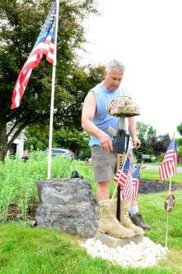 When Bethlehem Township resident Alan Yuknis awoke Memorial Day, he found that somebody had broken off the toy M-16 rifle and removed the plastic military helmet from a roadside display that he had installed at the corner of his property, which honors those men and women who serve in the military and law enforcement.