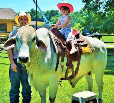 Bull BlastCeleste Matheny, of New Jersey, takes a ride on Gus, a Brahman steer, during the Willow Brook Bull Blast & Western Heritage Festival, held June 30 and July 1 at Willow Brook Farms, North Catasauqua. Steer owner Dan Welsh, of Palmerton, leads Gus along the path.PRESS PHOTOS BY TINAMARIE MARTIN
