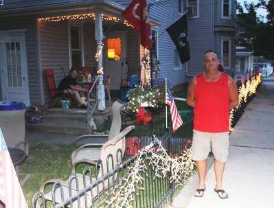 Bob Trevorah shows off his brightly lit home, decorated and ready for Independence Day, on Howertown Road across the street from the former Lincoln School building.PRESS PHOTO BY PAUL CMIL