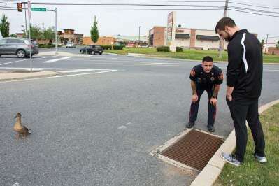 This anxious mother duck watched closely as South Whitehall Patrol Officer Kevin Azar and St. Luke's West End Fitness Trainer Jeff Baker ponder the fate of her ducklings. They fell through the storm sewer grate at the Cetronia Road entrance to St. Luke's West End complex, South Whitehall.PRESS PHOTO BY LOU WHEELAND Copyright - Lou Wheeland Photography
