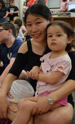 Children of all ages were fascinated with “Mr. Bill” William F. Petterson of Mad Science of Lehigh Valley, who presented the program, “Sounds Like Science,” on June 21 at Northampton Area Public Library. Haini Teng and daughter Thena Reyes of Allentown attended the event. Press photo by Stacey Koch