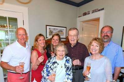 PRESS PHOTO BY DANA GRUBBIn honor of their 70th wedding anniversary, Thomas and Louise Keim, center, were toasted by son-in-law Jamie Hunsicker, daughter Linda Hunsicker, granddaughter Lindsey Hunsicker, daughter Joanne Keim and son-in-law Bryan Van Sweden. The celebration was hosted by the Hunsickers in their Bethlehem residence.