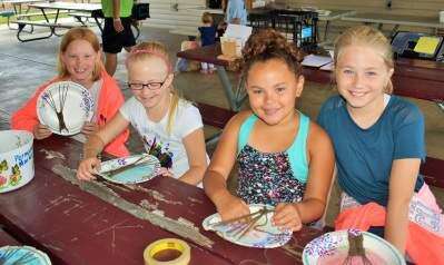 During the Crafts and Laughs program June 28, Olivia Warren, Alaina Dorsey, Bella Garcia and Ella Dorsey show off their finished tree weaving projects. These summerlong sessions are held at North Catasauqua William J. Albert Memorial Park.