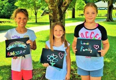 Anessa Rodriguez shares her picture of a rainbow; Layla Zimmerman shows her flower; and Amanda Votral displays a love and family picture - all crafts made using glue and water colors during the Fun in the Sun program at Catasauqua Park & Playground, 501 American St., June 28.