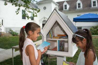 PRESS PHOTOS BY LOU WHEELANDSisters Elenis and Elinny Rivera of Allentown, check the available books in the “Little Library” at Calvary Moravian Church, Allentown, before spending time at the church summer festival July 14. Copyright - Lou Wheeland Photography