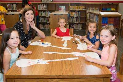 PRESS PHOTOS BY LOU WHEELANDYoungsters Peyton, Raegan, Candence and Emily, with Parkland Library Youth Services Jaclyn Hoimes, work on their “Libraries Rock” paper guitars in the summer reading program at Ironton Elementary School. Copyright - Lou Wheeland Photography