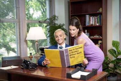 Entertaining “Business”: Frankie Grande stars as J. Pierrepont Finch, opposite Meredith Kate Doyle as Rosemary Pilkington in the Muhlenberg Summer Music Theatre (MSMT) production of “How to Succeed in Business Without Really Trying,” through July 29, Baker Theater, Trexler Pavilion for Theatre and Dance, Muhlenberg College, Allentown. MSMT co-founder Charlie Richter directs the musical. Muhlenberg dance program director and founder Karen Dearborn choreographs the production, with music direction by Bryan L. Wade, scenic design by John Raley, costume design by Hunter Kaczorowski, and lighting design by Gertjan Houben. “How to Succeed in Business Without Really Trying,” with music by Frank Loesser and book by Abe Burrows, Jack Weinstock, and Willie Gilbert, is based on Shepherd Mead’s 1952 book of the same title. Tickets: Trexler Pavilion for Theatre and Dance box office, Muhlenberg College, 2400 Chew St., Allentown; muhlenberg.edu/smt; 484-664-3333