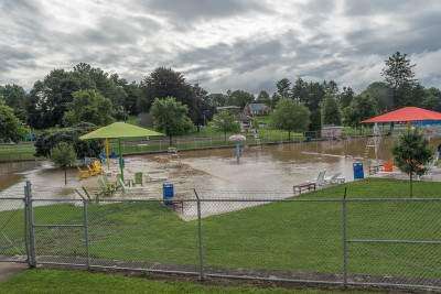 Left: In this Aug. 4 photo, the pool at Catasauqua Park & Playground, 501 American St., is completely flooded after a storm hit the Lehigh Valley Aug. 3-4 and the Catasauqua Creek overflowed. Due to damage caused by the storm, the pool will not reopen this season. See next week's edition for details. Copyright - Scott M. Nagy