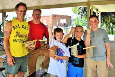 Royce Winiger, Collin Paone, Hunter Sopak and beekeepers John Bodisch, of Bethlehem, and Rick Sabo, of Coplay, show off their bee condos made Aug. 2 during Crafts and Laughs. The program is held at North Catasauqua William J. Albert Memorial Park, 701 Grove St.
