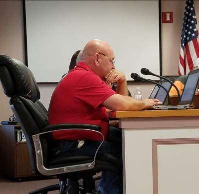 Council member Kevin Lott reviews the evening's agenda on his laptop.