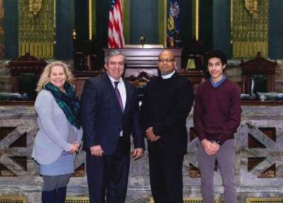 CONTRIBUTED PHOTOThe Rev. Nelson Quinones, of Bath, served in January as the guest chaplain for the Pennsylvania Senate. Quinones led the opening prayer at the Capital in Harrisburg. Pictured with Quinones are his wife, Jessica, and their son, Nicolas, and state Sen. Pat Browne, R-16th.