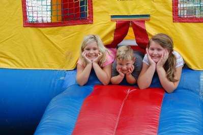 Sophia and William Danchez, and Laura Wanamaker take a moment from jumping in the bounce house. They had been in the house since arriving at Summerfest, said April Osterstock, grandmother to the Danchez children.