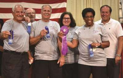 PRESS PHOTO BY ED COURRIERMovers and Shakers team members celebrate their Sept. 2 win at the Celebrity Grape Stomp during The Great Allentown Fair, which ran Aug. 28-Sept. 3. Squeezing the most juice from the flattened grapes are, from left, team coach John Landis, from Vynecrest Vineyards & Winery in Breinigsville; Whitehall Township Mayor Mike Harakal Jr.; Lehigh County Executive Phillips Copyright - &Copy; Ed Courrier