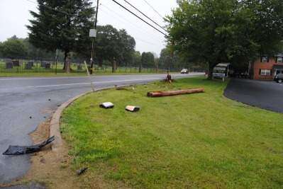 PRESS PHOTOS BY SUSAN BRYANTABOVE: Debris from a 2008 GMC Sierra pickup and Verizon pole are scattered on the grass in front of the Lehigh Valley Press office, South Whitehall, after the truck severed the pole around 7 a.m. Sept. 11. RIGHT: Don, an outside plant technician with Verizon, places a chain around the damaged pole Sept. 11 before unscrewing the bolts and wires from it.