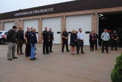 PRESS PHOTOS BY SUSAN BRYANTSouth Whitehall Township Police officers and employees joined members of Greenawalds Fire Company Sept. 11 during a moment of silence honoring the lives of those individuals killed in the 911 terrorist attacks on Sept. 11, 2001 in New York, Washington D.C. and Pennsylvania at Greenawalds Fire Company.