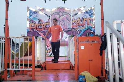 Vincent Basak waits for the next riders on “Rockin' Out.” Originally from Green Bay, Wis., Vincent has worked in carnivals for almost 20 years. The kids cheered as they whirled by on “Rockin' Out,” and Vincent cheered back enthusiastically.