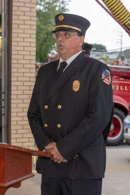 PRESS PHOTOS BY LOU WHEELANDGood Will Fire Chief Steve Oplinger sang the national anthem at the opening of the ceremony. Copyright - Lou Wheeland