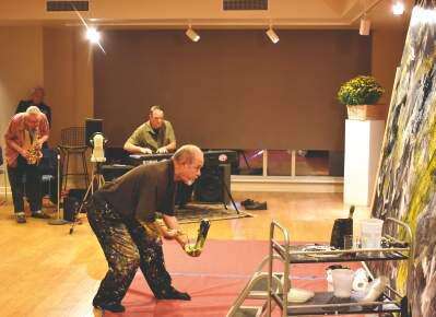 American artist, shaman, and free spirit Barnaby Ruhe prepares to pounce on an 8-foot-by-8-foot wood panel with a fully-loaded paintbrush at the Baum School of Art, Fifth and Linden streets, Allentown. At the Sept. 20 “Third Thursday” opening reception for his “Regenesis” exhibit, Ruhe created a spontaneous canvas to the improvisational jazz of saxophonist Gary Joseph Hassay and keyboardist Dan Copyright - &Copy; Ed Courrier