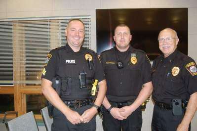 PRESS PHOTO BY PAUL WILLISTEINNewly-promoted Salisbury Township Police Department Cpl. Kyle Rehatchek, center, is introduced at the Oct. 11 Salisbury Township Board of Commissioners meeting. With Rehatchek are Chief of Police Allen W. Stiles, right and Sgt. Donald Sabo Jr., left. Rehatchek, 34, has been with the township police department for 11 years, beginning Oct. 8, 2007. He will be a patrol
