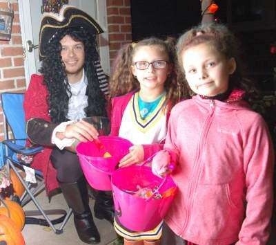 Trick or treat! Tweet Published October 31. 2018 12:00AM by The Press John Kuharik, dressed as Captain Hook, greets Devon Saltzer-Kuharik and Rowan Kuharik as they trick or treat Oct. 26 in Coplay.