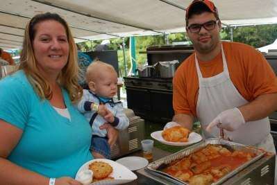 Press photos by Al ReckerJill Gruver, of North Catasauqua, is served some halupkis by Matthew J. Ross, of Coplay, at the 55th annual American Club of Coplay picnic held Sept. 8.