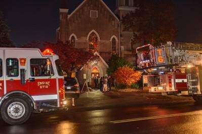Whitehall Township voters wait outside First Presbyterian Church of Hokendauqua, a polling location, Tuesday night while firefighters inspect the building after a report of a fire. Crews discovered a smoking motor in the basement of the church, 3005 S. Front St., but found no fire, according to reports. Because voting was interrupted for a time, the polls remained open there until 8:30 p.m.PRESS Copyright - Scott M. Nagy