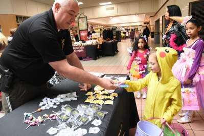 PRESS PHOTO BY JIM MARSHAlthough Salisbury Police Department Officer Richard Nothstein was assigned to staff the federal Drug Enforcement Agency Drug Take Back table at South Mall, Lehigh Street, Oct. 27, he loaded up on items for his giveaway table, knowing the day was also scheduled as trick or treat day for kids in costume at the mall. ABOVE: Serenity Striker, of Heidelberg Township, dresses as