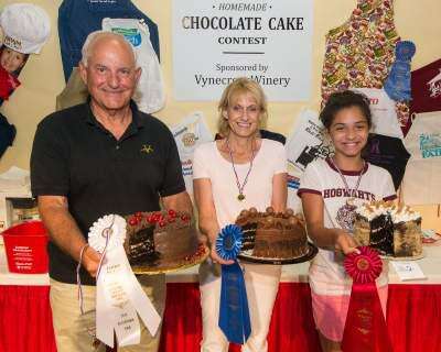 Holding the third-place winning cake baked by Julie Hamilton of Allentown, is John Landis, founder of Vynecrest Wineries, sponsor of the chocolate cake contest at this year's Great Allentown Fair. First place winner Eva Seibert holds her Dark Chocolate Cake with Caramel Filling and second-place winner Amelia Swoyer, shows off her S'mores Cake. Good cooking must run in the family as Amelia is Eva's Copyright - Lou Wheeland Photography