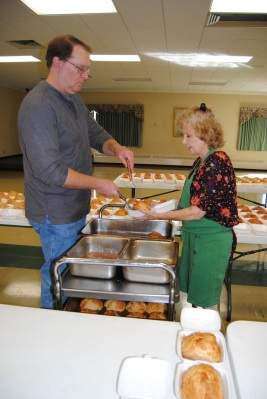 Northern Valley Ambulance Board of Directors President Kevin Schmidt and Charlotte Magee, volunteer with NOVA Ladies Auxiliary, place a fresh baked apple dumpling into a container for their apple dumpling sale Oct. 28 at the ambulance headquarters in Ormrod.
