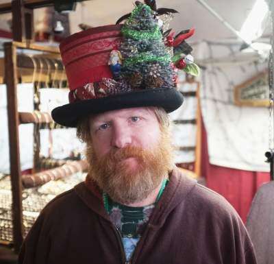 press photos by Dennis GlewDavid Adams, who is selling ornaments he made from recycled Christmas trees, sports a hat he decorated for himself.