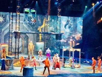 The multi-media theater-style arena show is one-part Circue du Soleil, for its high-wire aerial fabric work; one-part indoor motocross, for its whizzing motorbikes that fly through the air, zoom in front of each other in seeming near-miss collisions, with one even flipping a 360-degree, and one-part World Wrestling Entertainment, for its strategic wrestling holds and mixed martial-arts choreography.