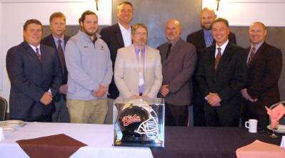 PRESS PHOTO BY AL RECKERDuring the 71st annual Bury the Hatchet dinner, a tradition that takes place before the annual Turkey Day football game between Northampton Area High School and Catasauqua High School, speakers pause for a photo before exchanging some friendly jibes. Those in attendance at the event, held Nov. 20 at Northampton Banquet & Event Center, included CHS head football coach