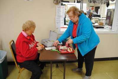 PRESS PHOTOS BY SUSAN BRYANTNorthern Valley Ambulance Ladies Auxiliary member Marie Dean accepts payment from Pat Krapf of Slatington for lunch Dec. 2 at the holiday shop and cutout cookie sale at NOVA's Ormrod headquarters.