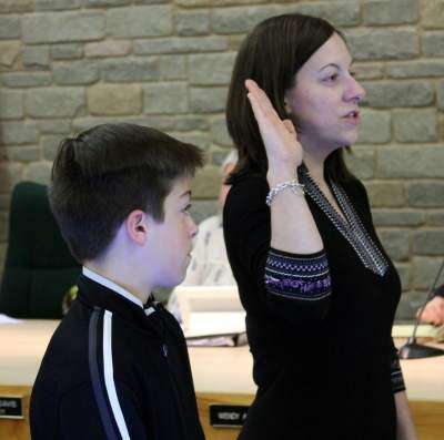 press photo by bernie o'hareKristine Blake, accompanied by her son, takes the oath of office.