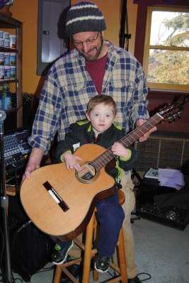 Steve Cebenko of New Tripoli assists youngster J.J. Treiber of South Whitehall Township as he plays Cebenko's guitar and sings for shoppers Dec. 8 during the open house at Eagle Point Farm Market and Greenhouse, Trexlertown.PRESS PHOTO BY SUSAN BRYANT